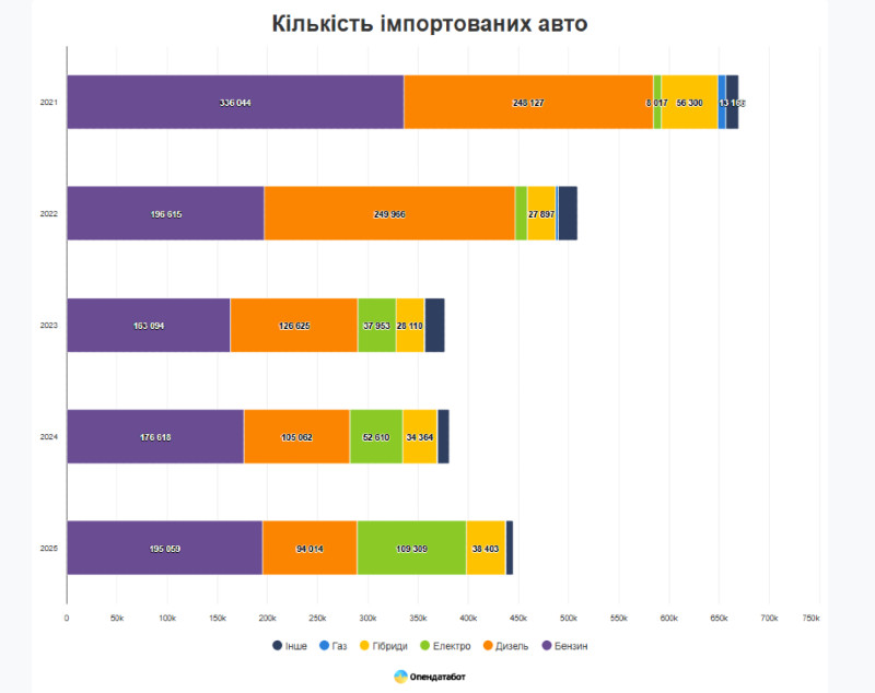 Кожен четвертий транспортний засіб, що перетнув кордон торік, був на акумуляторних джерелах живлення: 109 309 од. Попит на електрокари аналітики пов'язують з поверненням у 2026 році податків на їх ввезення. Проте лідерство все одно за бензиновими авто: 195 059 транспортних засобів.