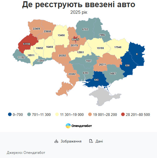Майже кожен п'ятий ввезений транспортний засіб був зареєстрований у столиці: 80 425 авто. Львівщина утримує друге місце - 51 730 автівок. До п'ятірки лідерів також увійшли Київщина (28 179), Дніпропетровщина (26 311) та Рівненщина (23 608).