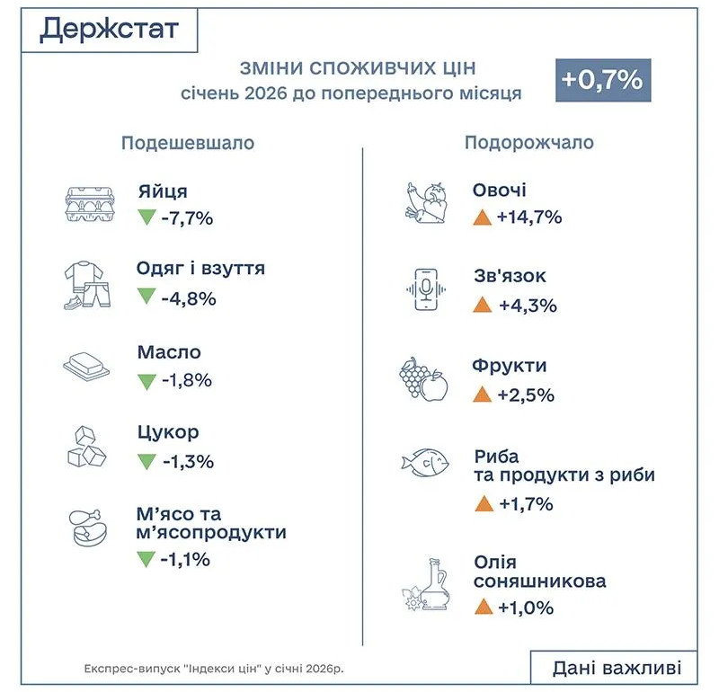 Споживчі ціни в Україні у січні 2026 року порівняно з груднем зросли