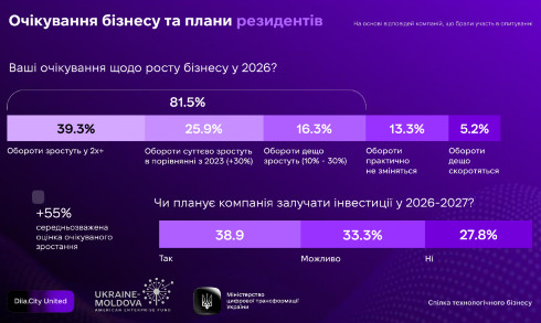 Учасники опитування також дали відповіді на питання щодо очікувань на 2026 рік. Зокрема, 81,5% респондентів прогнозують зростання бізнесу - 39,3% вважають, що обороти зростуть щонайменше вдвічі, 25,9% - на 30%, 16,3% - на 10-30%. 72,2% також прогнозують залучення інвестицій у період 2026-2027 років.
