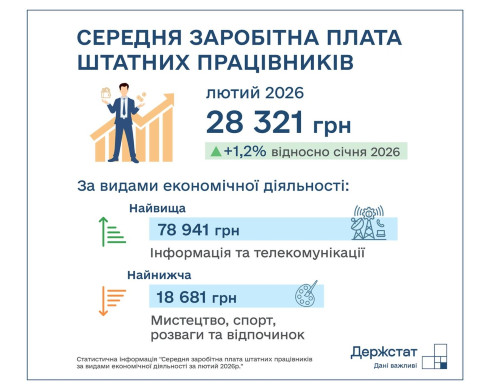 Згідно з оприлюдненими даними, у лютому 2026 року середня заробітна плата штатних працівників по Україні склала 28 321 грн проти 27 975 грн у січні (+1,2%).