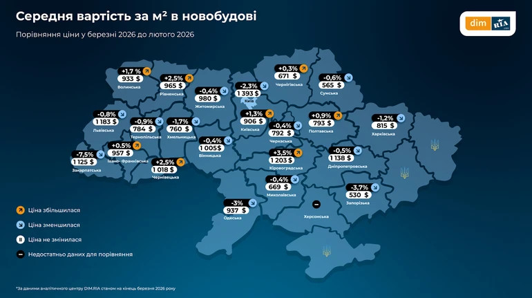 Зазначається, що Київ залишається на першому місці за ціною: середня вартість квадратного метра у березні становила $1 393/м² (-2,3% порівняно з лютим 2026). Найдорожчі новобудови зосереджені в Печерському районі - середня вартість квадратного метра становить $2 669, найдоступніші можна знайти у Деснянському районі, де середня ціна - $888/м².