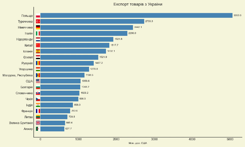 Географічна структура зовнішньої торгівлі України (експорт) у січні-грудні 2025 року, млн. дол США. Дані: Державна митна служба України.