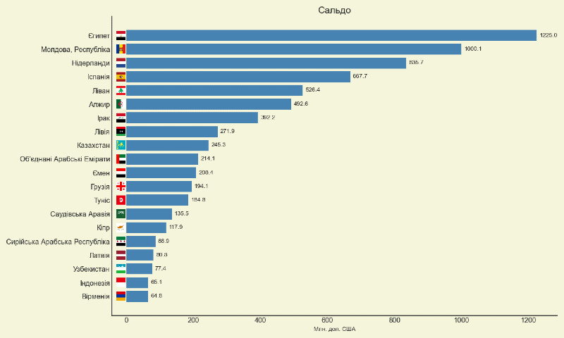 Географічна структура зовнішньої торгівлі України (позитивне сальдо) у січні-грудні 2025 року, млн. дол США. Дані: Державна митна служба України.