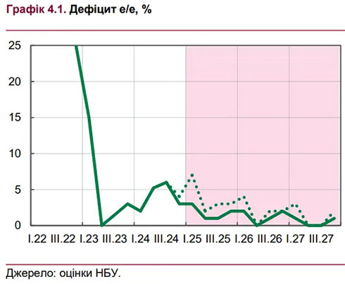 Так, у 2025 році дефіцит електроенергії з урахуванням імпорту оцінюється на рівні 3% (проти 4% в інфляційному звіті за січень 2025 року), у 2026 році - 1% (2% - за прогнозом у січні).