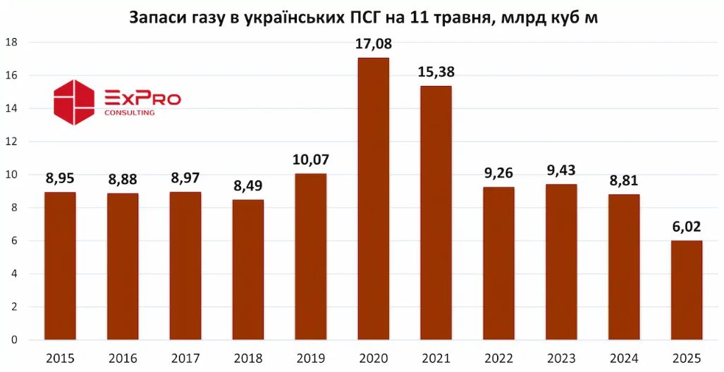 За оцінками ExPro, станом на кінець травня 2025 року запаси газу в українських ПСГ можуть досягти майже 6,6 млрд кубометрів при стабільному імпорті природного газу, який складає близько 14 млн кубометрів на добу в останні дні.