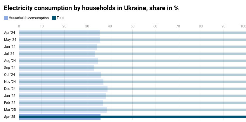 За даними ExPro, населення споживає більше електроенергії, ніж промисловість, з початку повномасштабної війни, за винятком декількох місяців.