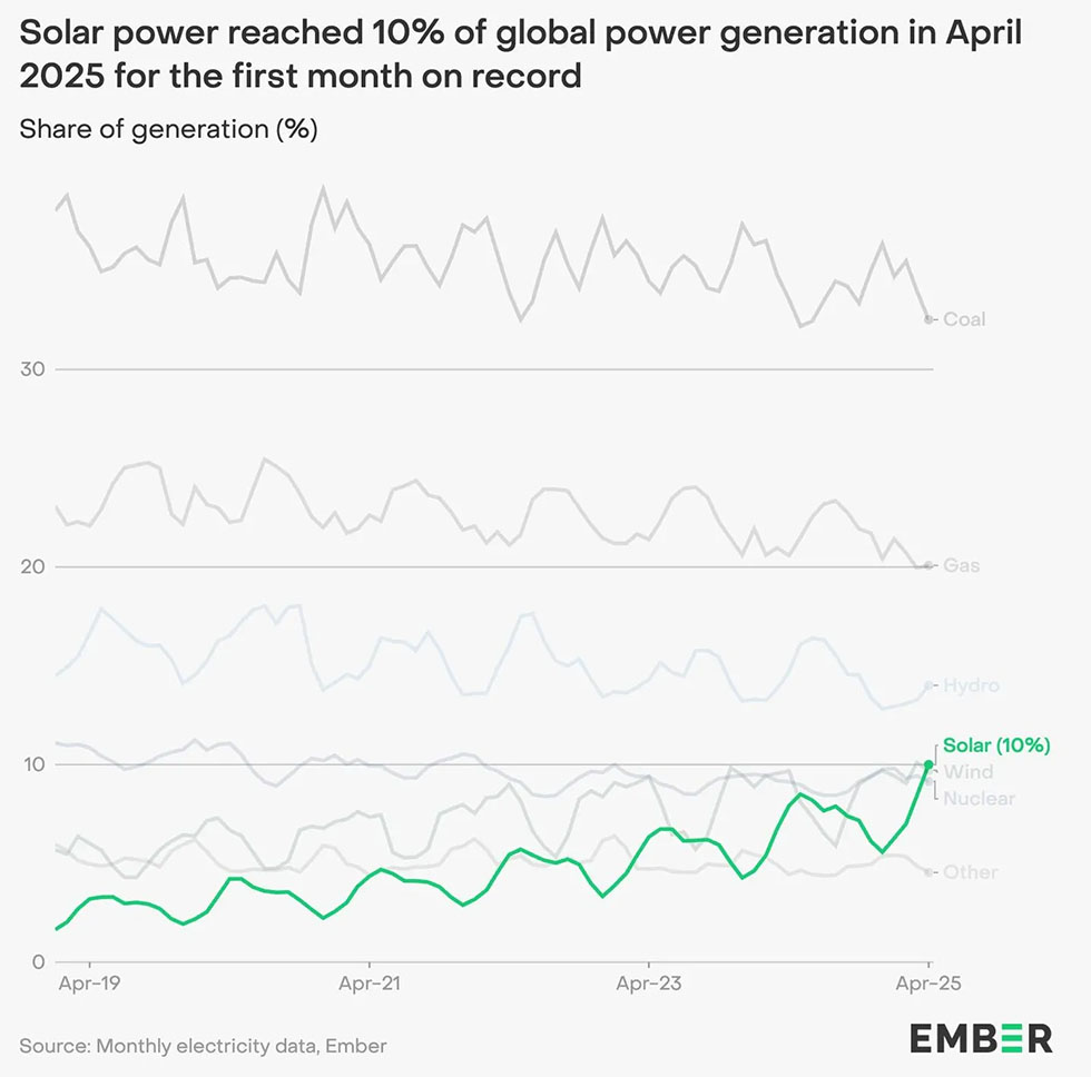 Сонячна енергія вперше досягла 10% від загального світового виробництва електроенергії у квітні 2025 року, свідчать дані аналітичного центру Ember Energy.