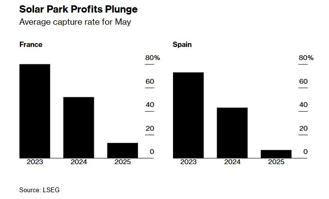 В Іспанії так званий коефіцієнт уловлювання, ключовий показник прибутковості активів відновлюваної енергетики, у травні в середньому становив лише 7% проти 43% рік тому.