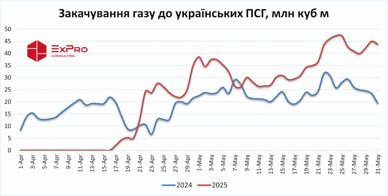 Наростити обсяги закачування вдалося за рахунок імпортованого ресурсу, який склав близько 45% від загального обсягу закачування у травні, або близько 500 млн кубометрів.