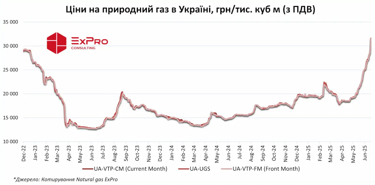 У середу, 18 червня, ціни на природний газ на українському ринку різко зросли до 31 500 грн за 1000 кубометрів з ПДВ та сягнули найвищого рівня з листопада 2022 року. Про це пише ExPro.