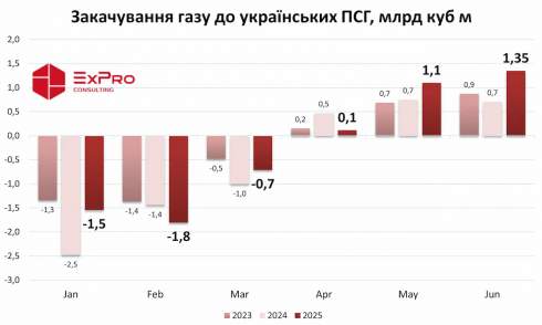 Україна впродовж червня 2025 року закачала до підземних сховищ газу (ПСГ) 1,35 млрд куб м природного газу.