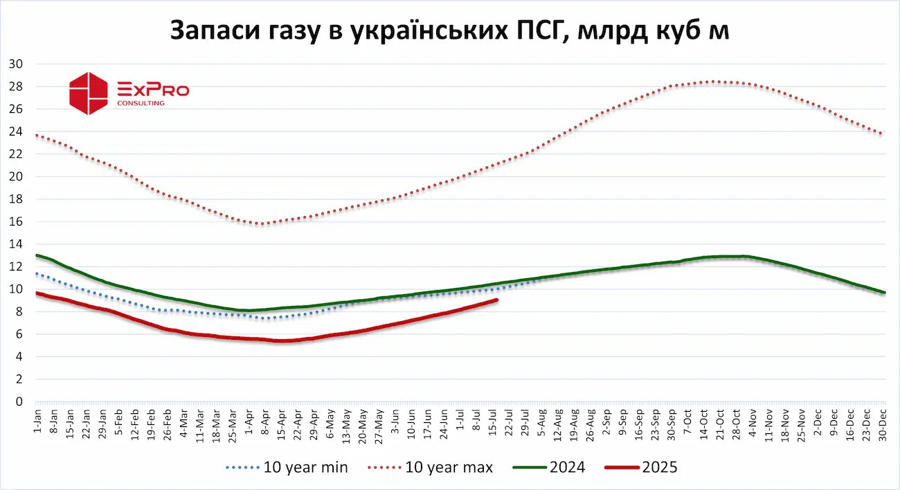 Тим не менше, у наступні місяці ймовірно обсяги закачування газу можуть скоротитися у зв'язку зі збільшенням споживання газу, передусім у вересні-жовтні. За оцінками ExPro, вже на початку серпня запаси в українських ПСГ досягнуть 10 млрд куб м.