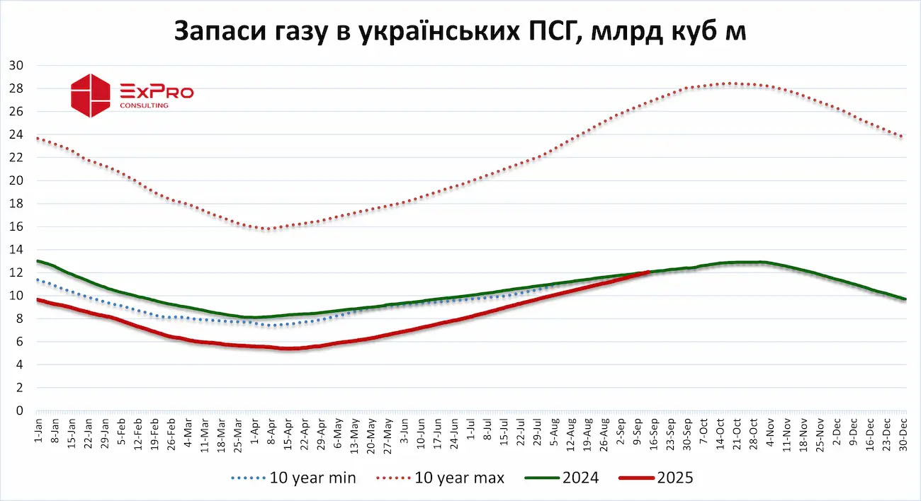 Так, станом на 14 вересня 2025 року в українських ПСГ зберігалося 12,055 млрд куб м природного газу, в той час як 14 вересня 2024 року у сховищах було 12,05 млрд куб м, на 0,05% або майже 5 млн куб м менше газу.