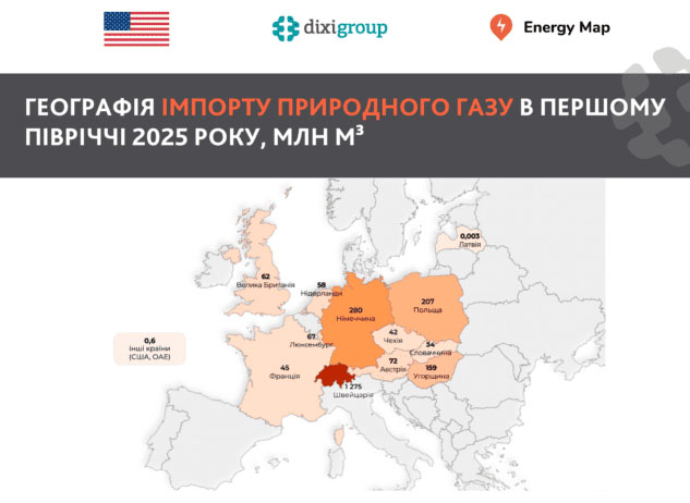 "Імпорт природного газу в Україну за перше півріччя 2025 року зріс у 19,3 раза порівняно з аналогічним періодом 2024 року. За даними Energy Map, країна придбала 2,30 млрд куб. м газу на суму $1,17 млрд, тоді як роком раніше обсяг імпорту складав лише 0,12 млрд куб. м на $36,41 млн", - йдеться у повідомленні.