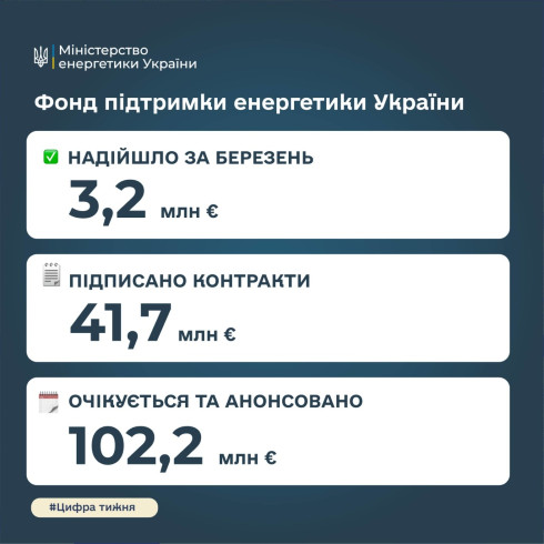 У березні 2026 року до Фонду підтримки енергетики України надійшло 3,2 млн євро, загальна сума внесків складає 1,854 млрд євро.
