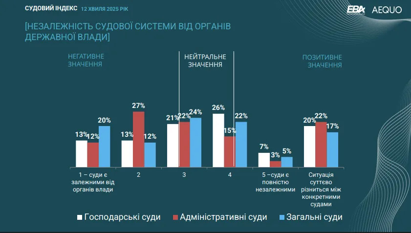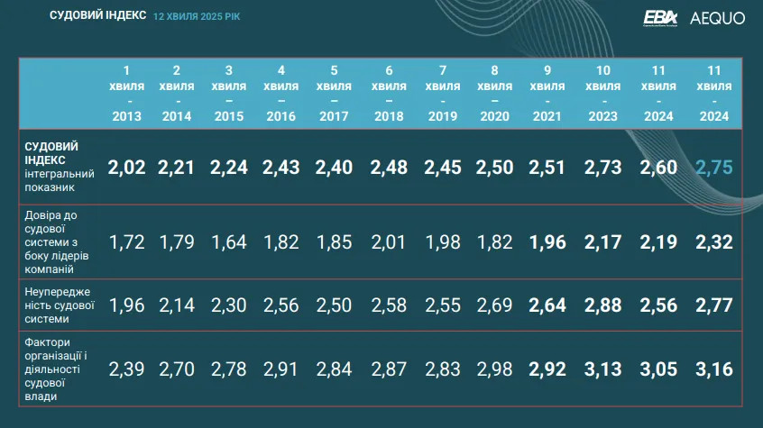 Бізнес дещо поліпшив оцінку судової системи України у 2025 році. Загальний показник судового індексу зріс до 2,75 бала (проти 2,60 бала торік) за п'ятибальною шкалою. Це найвищий показник за 12 років. Про це свідчать результати щорічного дослідження Європейської Бізнес Асоціації.