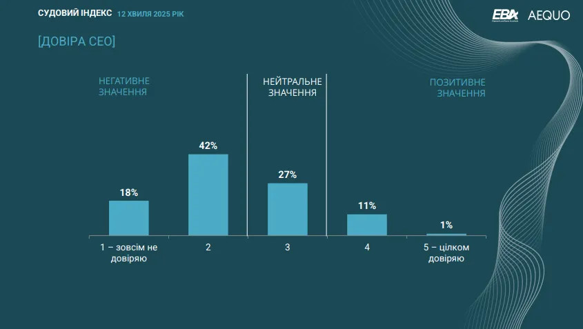 Дещо зріс і рівень довіри до судової системи з боку керівників компаній - до 2,32 бала (проти 2,19 бала у 2024-му). 12% опитаних СЕО скоріше або цілком довіряють судовій системі України, тоді як 60% - не довіряють. 27% керівників однаково довіряють і не довіряють судам.