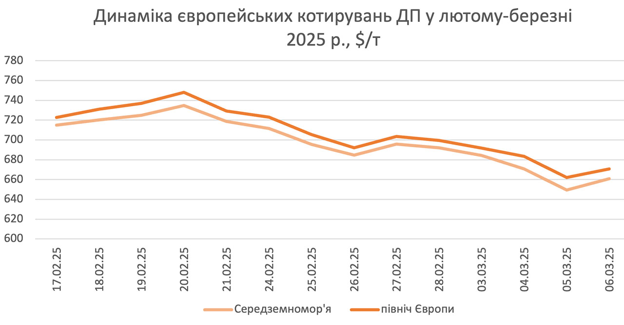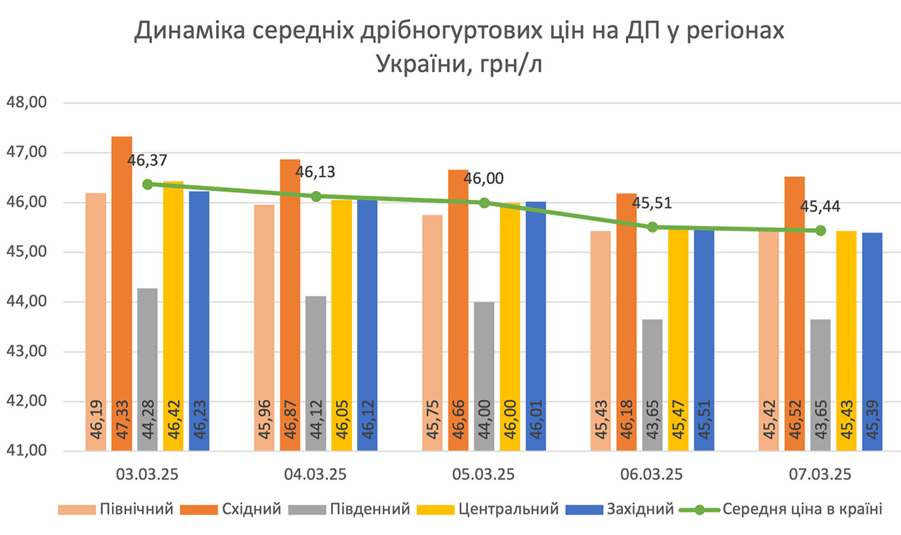 На 7 березня вартість дизпального у прикордонних областях становила 44,30-46,30 грн/л. Нижня межа відповідає цінам УНТК, ЗПЕК, «Нексен Ойл», «Дюваль компані».
