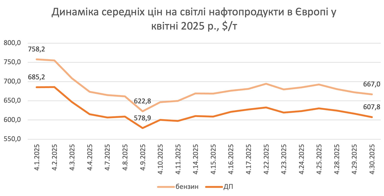За квітень ціни на нафту знизилися з $74 до $61 за барель, водночас європейські котирування бензину втратили в середньому $91/т (майже 3,40 грн/л за курсу на 1 травня), дизельного пального - $77/т (3,20 грн/л).