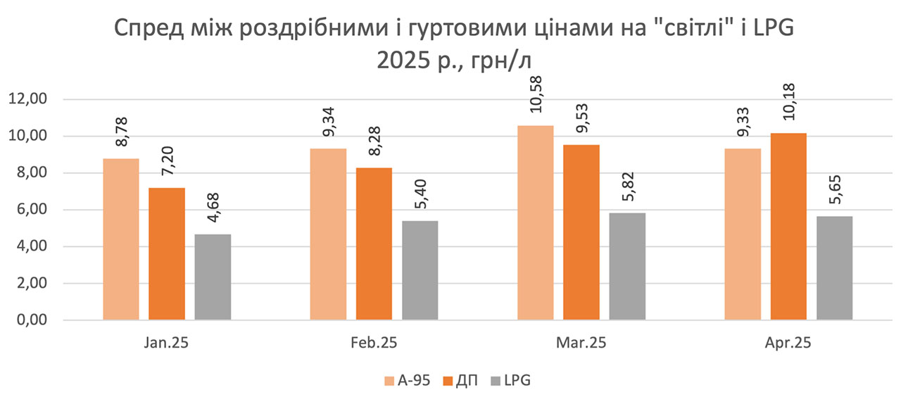 І якщо у разі з бензином роздріб поступився маржинальністю, то для дизелю, навпаки, рахував плюси. Так, націнка на А-95 (спред між гуртом і роздробом) за місяць у середньому зменшилась порівняно з березнем на 1,26 грн/л (9,33 грн/л), а на дизелі зросла на 65 коп./л, до найбільшого значення з червня 2023 року 10,18 грн/л. Газ залишився майже без змін - 5,65 грн/л (-17 коп./л).