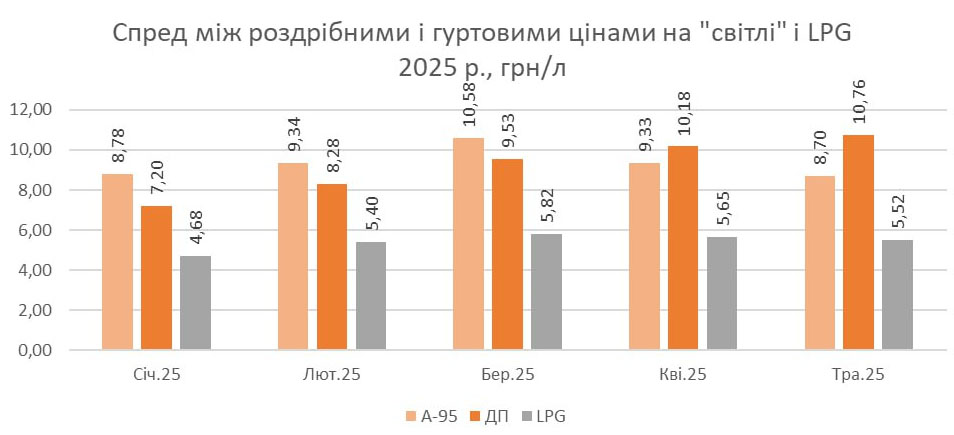 Водночас на стелах операторів середнього і нижнього цінових діапазонів ціни на LPG потроху знижувалися. Цьому сприяли як зниження гуртових цін (з початку місяця в середньому на 400 грн/т, до 54 750 грн/т, або на 0,22 грн/л, до 29,57 грн/л), так і непоганий спред між гуртом і роздробом, до середніх з 1 по 12 травня 5,52 грн/л.