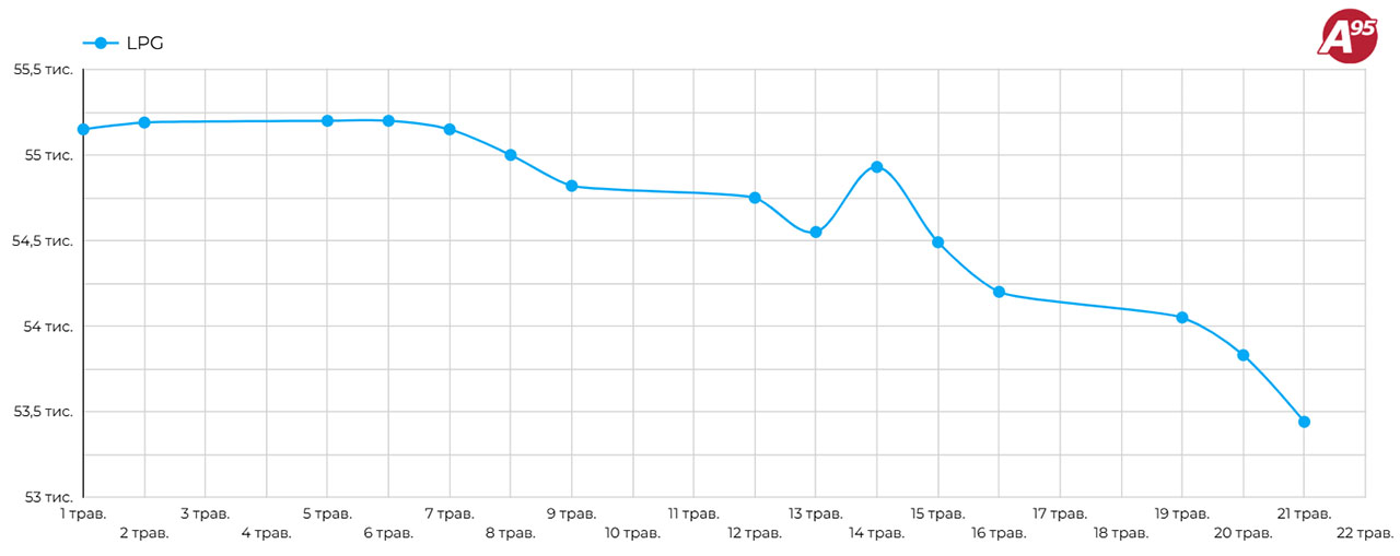 Протягом тижня через суттєве надходження дешевого скрапленого газу ціни на нього в країні продовжили знижуватися, досягнувши в середньому рівня середини торішнього вересня. Так, згідно з моніторингом Консалтингової групи «А-95», з 14 по 21 травня середня вартість газу знизилася на 1 490 грн/т, до 53 440 грн/т. На аукціоні Української енергетичної біржі 21 травня ціни на ресурс знизилася до 50 000 грн/т з мінімальних 53 000 грн/т тижнем раніше.