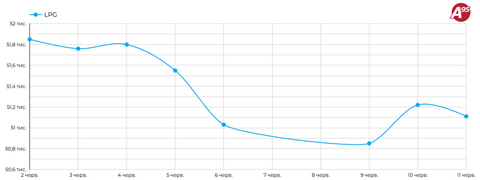 Протягом тижня, з 4 по 11 червня, середня вартість скрапленого газу зменшилася на 690 грн/т, до 51 110 грн/т. Водночас на аукціоні внутрішніх і приватних виробників 10-11 червня ресурс здорожчав у межах 500 грн/т. Про це свідчать моніторинг Консалтингової групи «А-95» і дані Української енергетичної біржі.