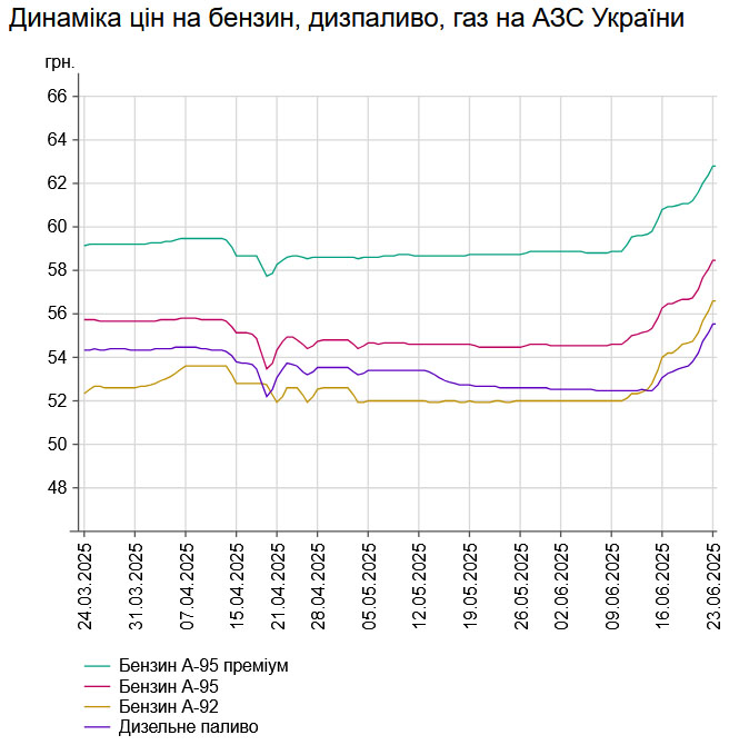 У понеділок, 23 червня, середні ціни на бензин А-95 в Україні зросли на 1,4% до 58,44 грн/л, на дизельне пальне - на 1,6% до 55,56 грн/л.