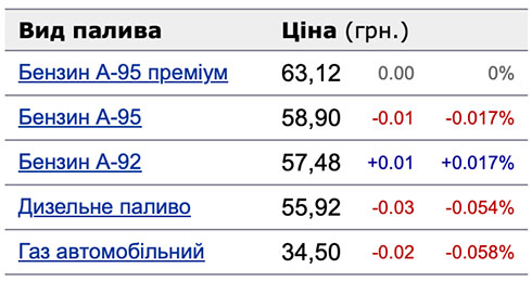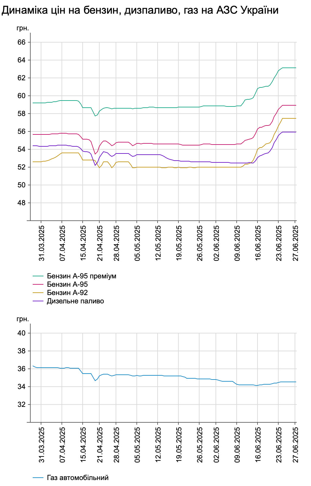 Зокрема, в Україні на заправках станом на 27 червня 2025 року зафіксовано такі середні ціни на пальне: бензин марки А-95 (преміум) - на рівні 63,12 грн/л; бензин марки А-95 - здешевшав на 0,02% - до 58,9 грн/л; бензин марки А-92 здорожчав на 0,02% - до 57,48 грн/л; дизельне пальне здешевшало на 0,05% - до 55,92 грн/л. Середня ціна автогазу становить 34,5 грн/л, що на 0,06% нижче порівняно із попереднім днем.