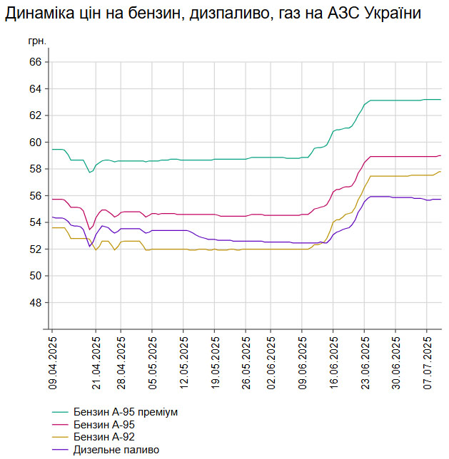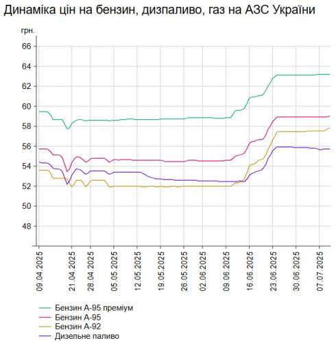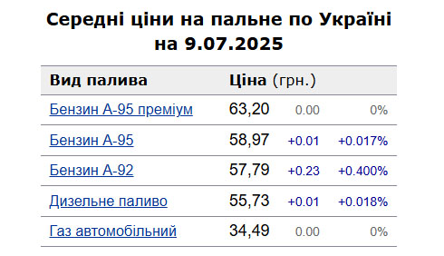 У середу, 9 липня, середня ціна на бензин марки А-95 в Україні зросла на 0,02% до 58,97 грн/л, на дизельне пальне - на 0,02% до 55,73 грн/л.