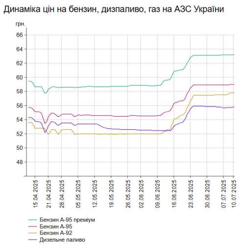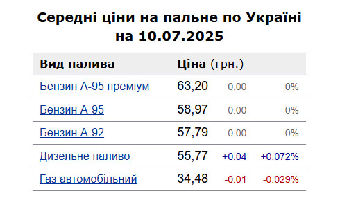 У четвер, 10 липня, середня ціна на бензин марки А-95 в Україні становить 58,97 грн/л, на дизельне пальне - здорожчало на 0,07% до 55,77 грн/л.