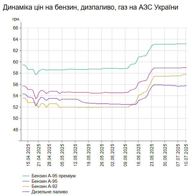 Зокрема, зафіксовано такі середні ціни на пальне: бензин марки А-95 (преміум) - 63,2 грн/л; бензин марки А-95 - 58,97 грн/л ; бензин марки А-92 - 57,79 грн/л; дизельне пальне - 55,73 грн/л (здорожчало на 0,02%). Середня ціна автогазу становить 34,48 грн/л, що на 0,02% дешевше порівняно із попереднім днем.