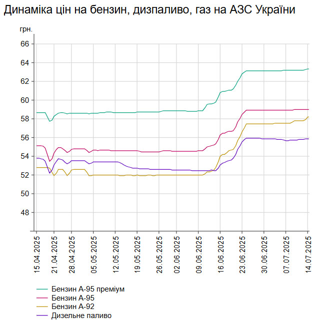 Зокрема, зафіксовано такі середні ціни на пальне: бензин марки А-95 (преміум) - 63,30 грн/л (здорожчав на 0,14%); бензин марки А-95 - 59,01 грн/л; бензин марки А-92 - 58,17 грн/л (здорожчав на 0,66%); дизельне пальне - 55,89 грн/л (здорожчало на 0,12%). Середня ціна автогазу становить 34,44 грн/л, що на 0,09% дешевше порівняно із попереднім робочим днем.