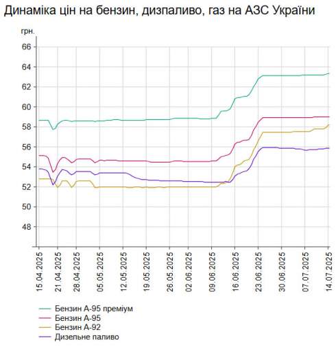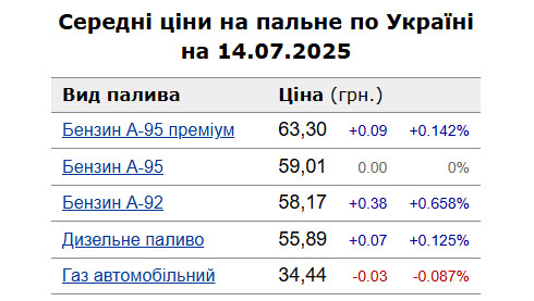 У понеділок, 14 липня, середня ціна на бензин марки А-95 в Україні становить 59,01 грн/л, на дизельне пальне - зросла на 0,12% до 55,89 грн/л порівняно із 11 липня.