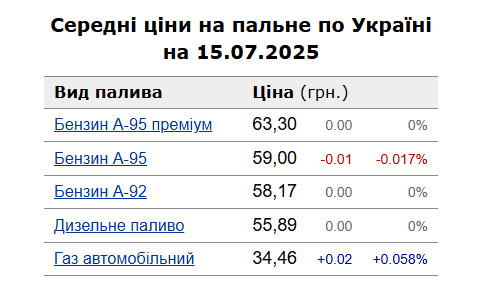 У вівторок, 15 липня, середня ціна на бензин марки А-95 в Україні знизилась на 0,02% до 59,01 грн/л, на дизельне пальне - зафіксувалася на рівні 55,89 грн/л.