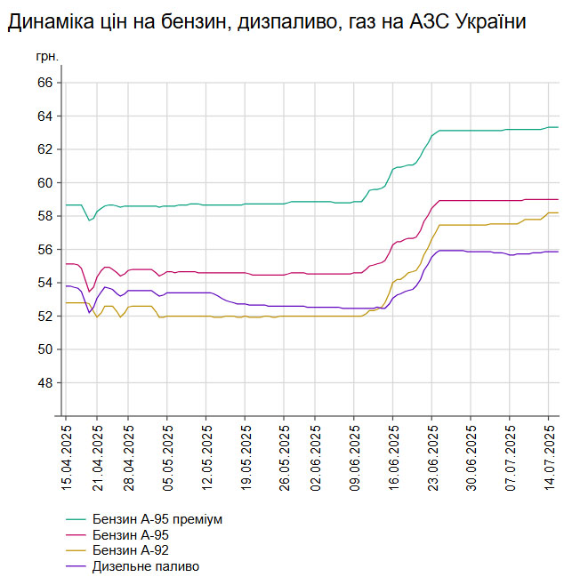 Зокрема, зафіксовано такі середні ціни на пальне: бензин марки А-95 (преміум) - 63,30 грн/л; бензин марки А-95 - 59,01 грн/л (здешевшав на 0,02%); бензин марки А-92 - 58,17 грн/л; дизельне пальне - 55,89 грн/л. Середня ціна автогазу становить 34,46 грн/л, що на 0,06% дорожче порівняно із попереднім днем.