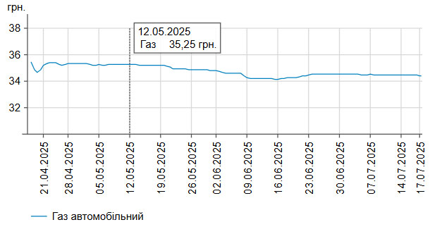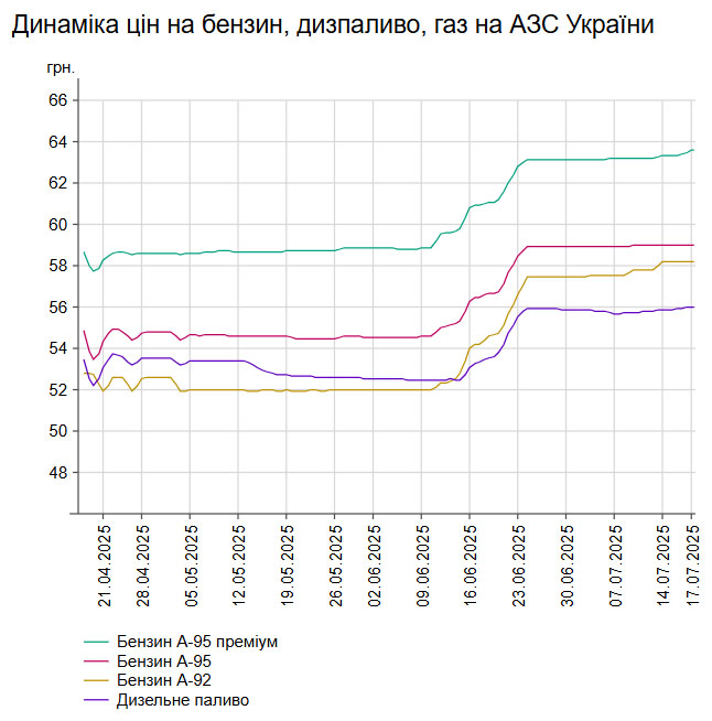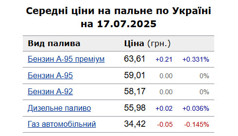 Зокрема, зафіксовано такі середні ціни на пальне: бензин марки А-95 (преміум) - 63,61 грн/л (здорожчав на 0,3%); бензин марки А-95 - 59,01 грн/л; бензин марки А-92 - 58,17 грн/л; дизельне пальне - 55,98 грн/л (здорожчало на 0,03%). Середня ціна автогазу становить 34,42 грн/л, що на 0,14% дешевше порівняно із попереднім днем.