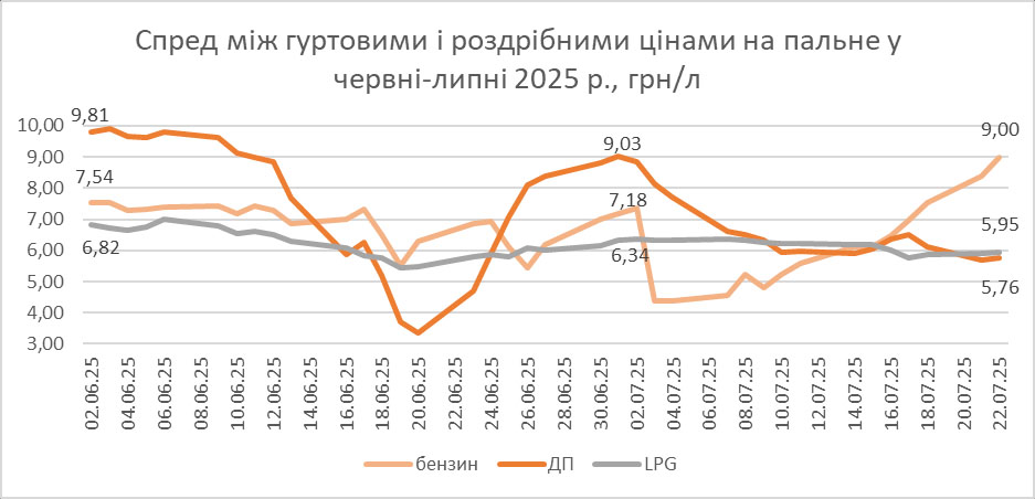 Напруга зберігається по дизпальному, де націнка складала 5,76 грн/л, ще зменшившись на 30 коп./л. Цей показник на майже 3,10 грн/л менше за середній в першому півріччі.