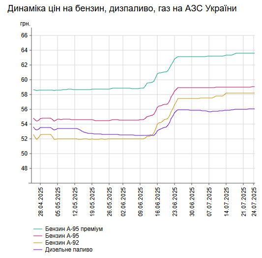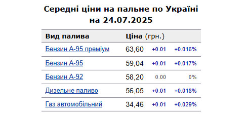 У четвер, 24 липня, середня ціна на бензин марки А-95 в Україні зросла на 0,017% до 59,04 грн/л, на дизельне пальне - збільшилася на 0,018% до 56,05 грн/л.