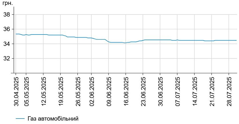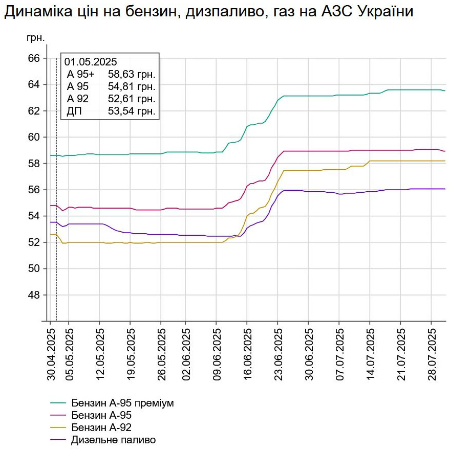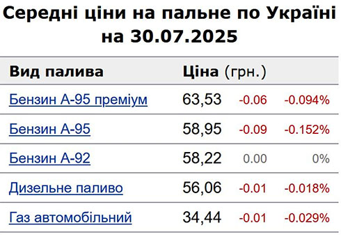 Зокрема, зафіксовано такі середні ціни на пальне: бензин марки А-95 (преміум) - 63,53 грн/л (здешевшав на 0,094%); бензин марки А-95 - 58,95 грн/л (здешевшав на 0,152%); бензин марки А-92 - 58,22 грн/л; дизельне пальне - 56,06 грн/л (здешевшало на 0,018%). Середня ціна автогазу становить 34,44 грн/л, що на 0,029% менше, ніж попереднього дня.