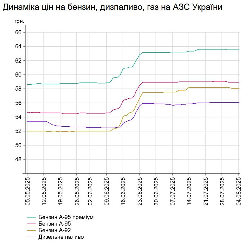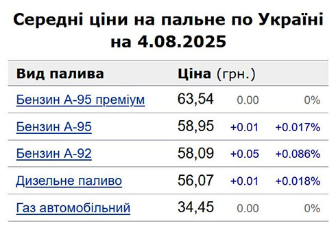 Зокрема, зафіксовано такі середні ціни на пальне: бензин марки А-95 (преміум) - 63,54 грн/л; бензин марки А-95 - 58,95 грн/л (здорожчав на 0,017%); бензин марки А-92 - 58,09 грн/л (здорожчав на 0,086%); дизельне пальне - 56,07 грн/л (здорожчало на 0,018%). Середня ціна автогазу становить 34,45 грн/л.