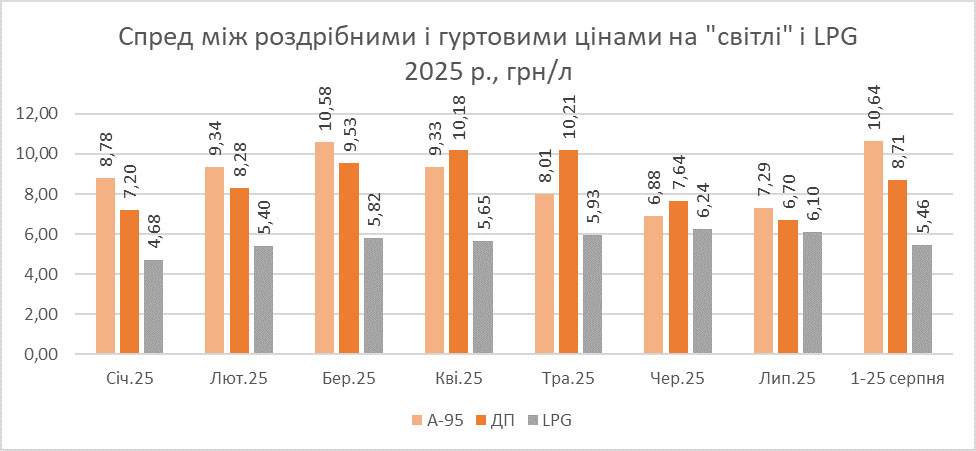 З початку серпня спред між роздрібними й гуртовими цінами на бензин у середньому зріс до найбільших з червня 2023 року 10,64 грн/л. На дизельному пальному зростання становило 2,02 грн/л (8,71 грн/л). Водночас різниця на скрапленому газі зменшилася на 64 коп./л, до 5,46 грн/л. Щоправда, треба зауважити, що у липні спред на бензині був мінімальним більш ніж за останній рік (3,35 грн/л), тому серпневі максимуми виглядають як компенсація за липневі страждання.