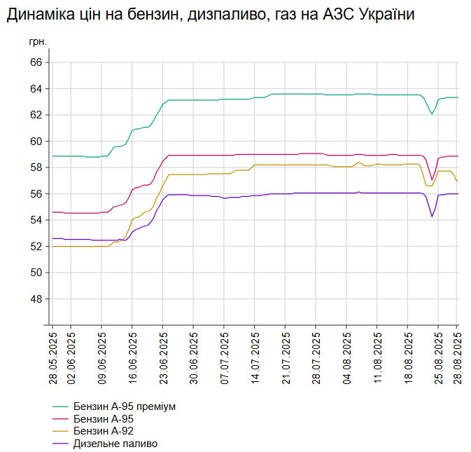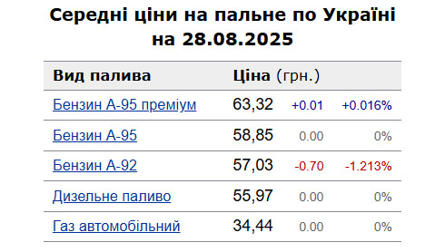 Зокрема, зафіксовано такі середні ціни на пальне: бензин марки А-95 (преміум) - 63,32 грн/л (здорожчав на 0,02%); бензин марки А-95 - 58,85 грн/л; бензин марки А-92 - 57,03 грн/л (здешевшав на 1,2%); дизельне пальне - 55,97 грн/л. Середня ціна автогазу становить 34,44 грн/л, що відповідає ціні попереднього дня.