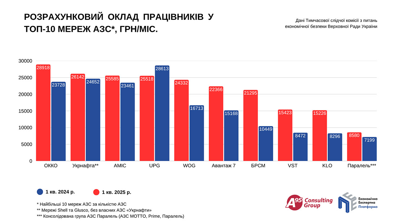 Так, у І кварталі 2025 року середня нарахована зарплата на АЗС ОККО сягнула майже 29 тис. грн, в «Укрнафті» - понад 26 тис. грн, в AMIC і UPG - понад 25,5 тис. грн.
