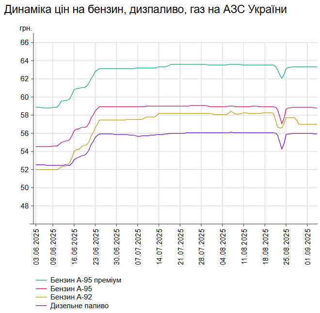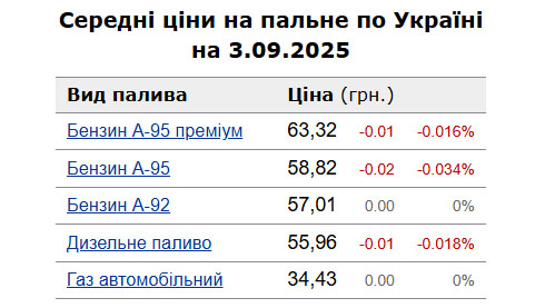 Зокрема, зафіксовано такі середні ціни на пальне: бензин марки А-95 (преміум) - 63,32 грн/л (здешевшав на 0,02%); бензин марки А-95 - 58,82 грн/л (здешевшав на 0,03%); бензин марки А-92 - 57,01 грн/л; дизельне пальне - 55,96 грн/л (здешевшало на 0,02%). Середня ціна автогазу становить 34,43 грн/л, тобто на рівні попереднього дня.
