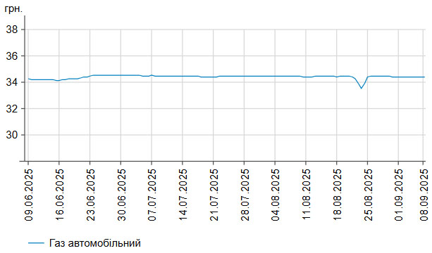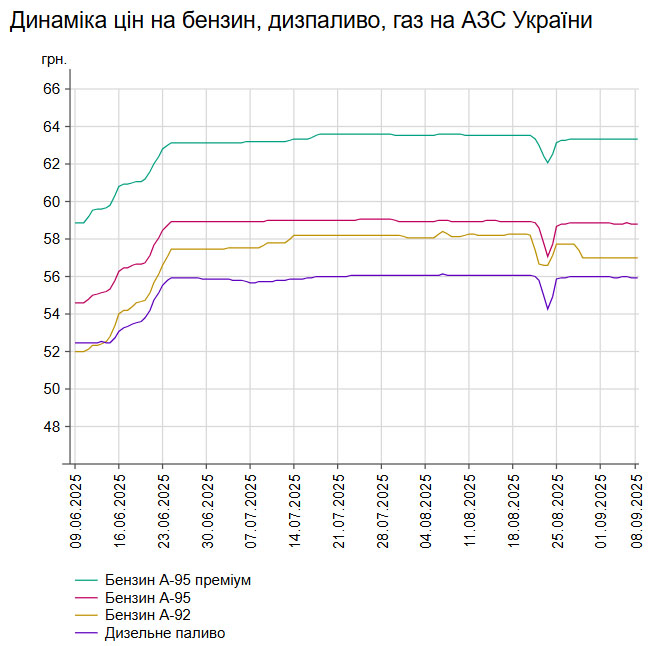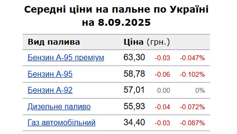 Зокрема, зафіксовано такі середні ціни на пальне: бензин марки А-95 (преміум) - 63,3 грн/л (здешевшав на 3 коп.); бензин марки А-95 - 58,78 грн/л (здешевшав на 6 коп.); бензин марки А-92 - 57,01 грн/л; дизельне пальне - 55,93 грн/л (здешевшало на 4 коп.). Середня ціна автогазу становить 34,4 грн/л, що на 3 коп. менше за рівень 4 вересня.