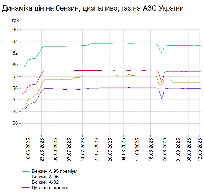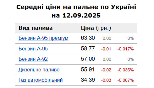 Зокрема, зафіксовано такі середні ціни на пальне: бензин марки А-95 (преміум) - 63,3 грн/л; бензин марки А-95 - 58,77 грн/л (здешевшав на 1 коп.); бензин марки А-92 - 56 грн/л; дизельне пальне - 55,91 грн/л (здешевшало на 2 коп.). Середня ціна автогазу становить 34,39 грн/л, що на 3 коп. менше порівняно із попереднім днем.