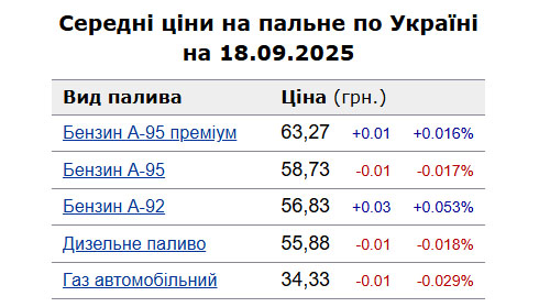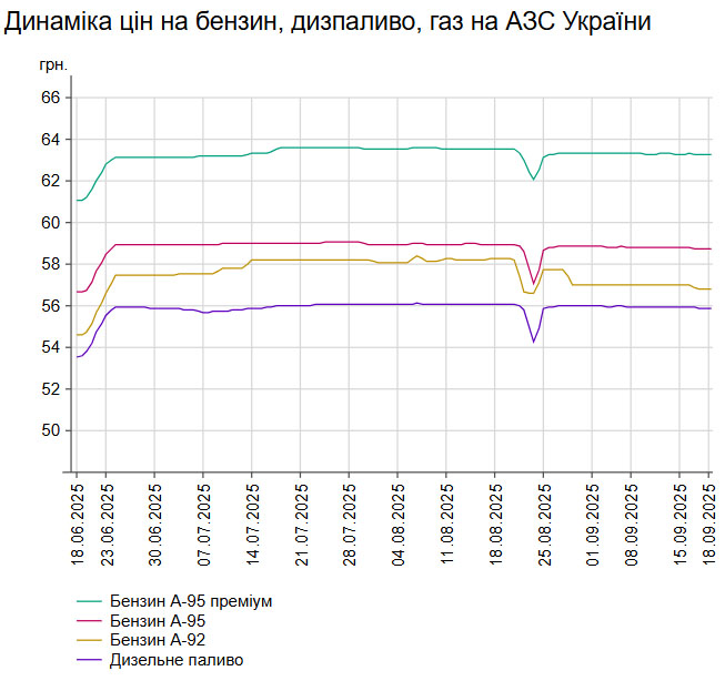 Зокрема, зафіксовано такі середні ціни на пальне: бензин марки А-95 (преміум) - 63,27 грн/л (здорожчав на 1 коп.); бензин марки А-95 - 58,73 грн/л (здешевшав на 1 коп.); бензин марки А-92 - 55,83 грн/л (здорожчав на 3 коп.); дизельне пальне - 55,88 грн/л (здешевшало на 1 коп.). Середня ціна автогазу становить 34,33 грн/л, що на 1 коп. дешевше порівняно із попереднім днем.