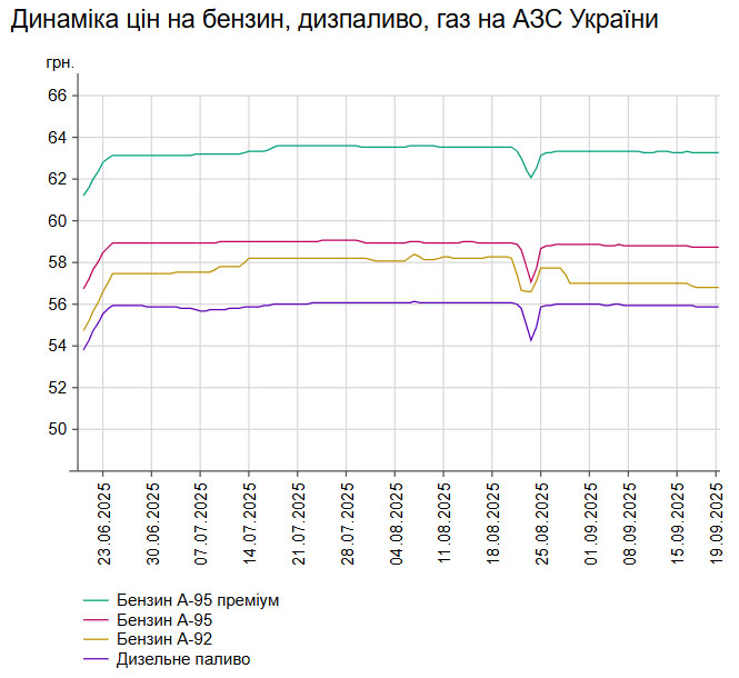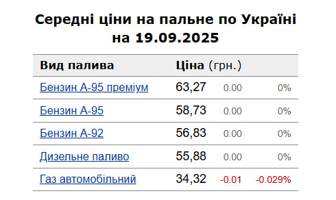 Зокрема, зафіксовано такі середні ціни на пальне: бензин марки А-95 (преміум) - 63,27 грн/л; бензин марки А-95 - 58,73 грн/л; бензин марки А-92 - 55,83 грн/л; дизельне пальне - 55,88 грн/л. Середня ціна автогазу становить 34,32 грн/л, що на 1 коп. дешевше порівняно із попереднім днем.